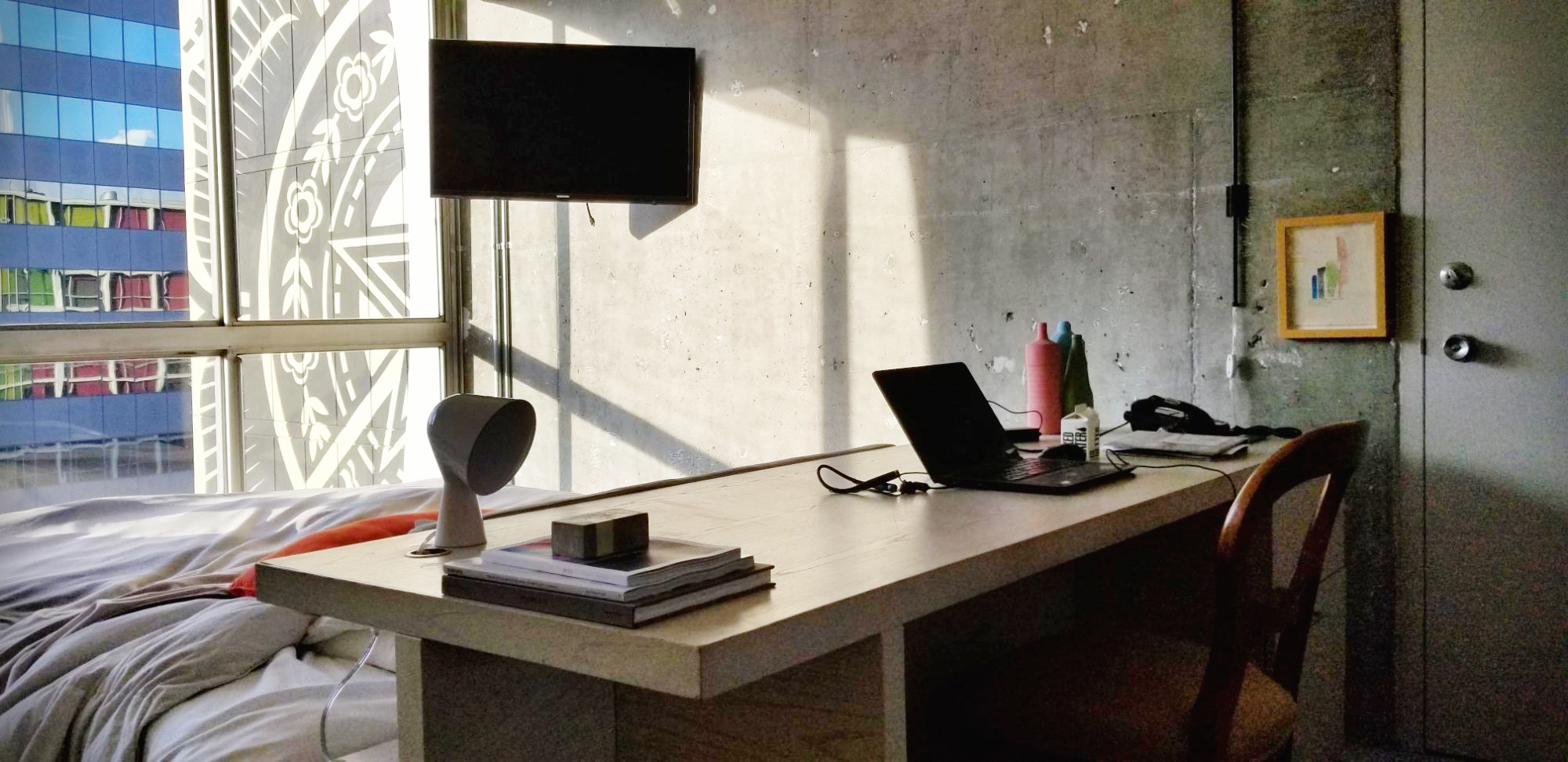 라인 호텔의 객실 문을 열고 들어서면 우선 세 가지가 눈길을 끕니다. 먼저는 네모난 박스형 구조가 재밌습니다. 그래서인지 객실에는 박스 워터가 놓여있네요. 그다음으로 침대 헤드보드 자리에 커다란 책상이 있다는 것. 그리고 콘크리트 느낌을 살리면서도 거칠지 않은 모던함이 눈길을 끕니다. 침대를 바라보며 자리한 이 책상은 정말 넓습니다. 노트북을 비롯해 여러 가지 장비를 올려놓아도 자리가 넉넉합니다. 또한 책상에 HDMI 연결잭을 비롯해 다양한 AV를 앞에 놓인 TV와 연결시킬 수도 있습니다. 만약 당신이 최고의 업무 환경을 찾고 있다면 라인 호텔은 정말 완벽함을 추구합니다. 이 때문에 이 호텔이 비즈니스맨들에게 어울린다고 말하고 싶습니다.