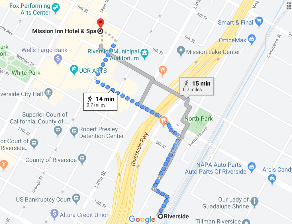 리버사이드 다운타운역에 내리면 행사장까지 무료 셔틀 버스가 운행됩니다. 셔틀은 오후 4시부터 9시 30분까지로, 운행간격은 30 ~ 45분이라고 하네요. 만약 버스를 놓치거나 타기가 부담스럽다면, 기차역에서 행사장까지는 약 0.7마일로 걸어서 15분 정도가 걸립니다. 아니면 우버를 이용하셔도 좋겠네요.
