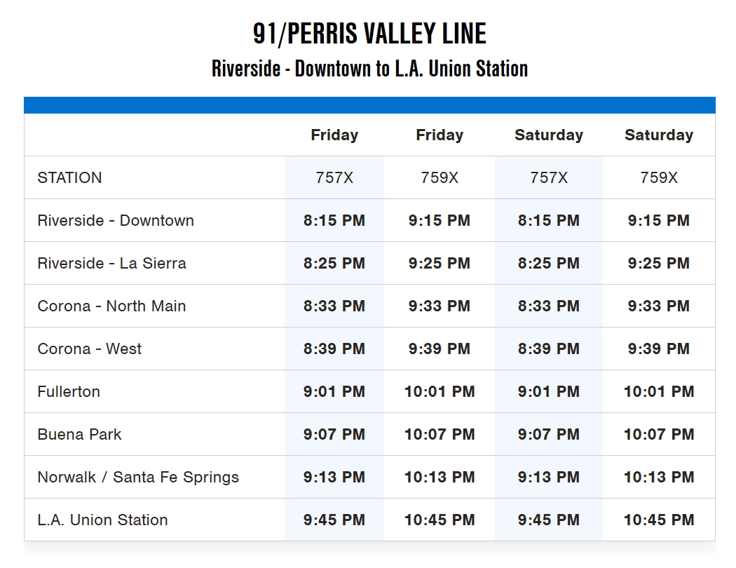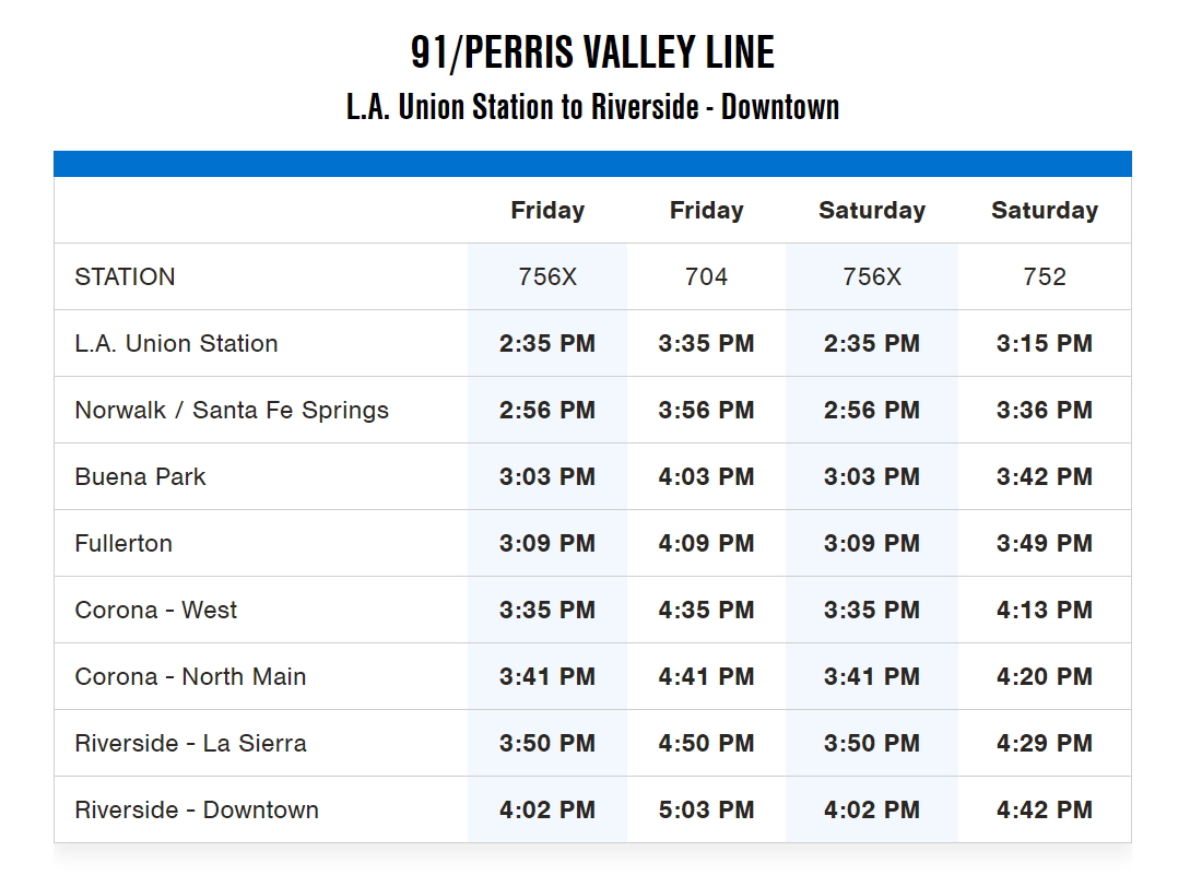LA 유니온 스테이션에서 출발하는 열차는 91 / PERRIS 밸리 라인입니다. 그리고 날자는 행사가 열리는 주 금요일과 토요일입니다. 열차는 금요일 2대, 토요일 2대가 이 특별열차에 해당됩니다. 먼저 금요일에는 오후 2시 30분에 출발하는 765X와 오후 3시 35분에 출발하는 704편이 있습니다. 토요일은 오후 2시 35분에 출발하는 765X와 오후 3시 15분 출발하는 752 열차입니다. 자세한 시간표는 아래 첨부한 것을 확인하시길 바랍니다. 목적지 역은 다운타운 리버사이드입니다. 다시 반대로 오는 시간표도 함께 첨부합니다.