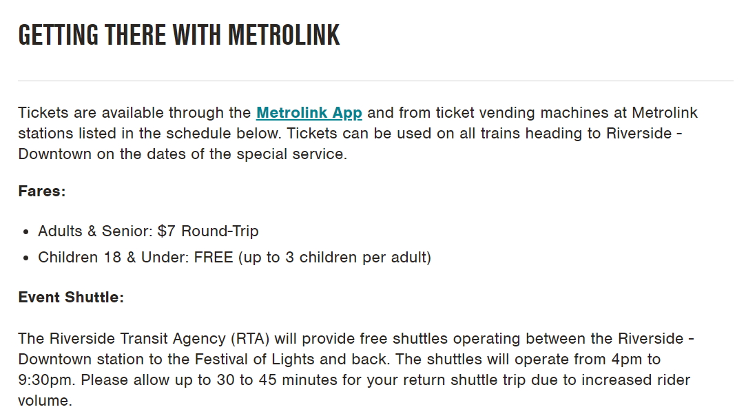 이런 문제들을 해결하고자 남가주 지역 광역 열차인 메트로링크(METROLINK)에서는 리버사이드 빛 축제 기간 특별 열차를 운영합니다. 물론 1주일 내내 다니는 것은 아니구요, 행사가 열리는 주 금, 토일에 운영을 하며 요금은 왕복 $7입니다. 그 먼 곳까지 편하게 기차로 저렴하게 갈 수 있다는 점은 정말 메리트가 아닐 수 없죠. 먼저 특별 열차가 운행되는 노선과 시간은 정해져있습니다. 반드시 해당 노선과 그 시간대의 열차를 타야 합니다.