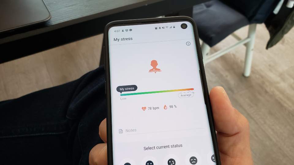 '스트레스 측정기'를 누르면 검지를 폰 뒤에 있는 측정기에 가져다 대라고 나옵니다. 폰 뒤 카메라가 있는 곳 옆에 자리한 창에 손가락을 대면 적외선과 붉은색 불빛이 나옵니다. 이 측정 방법은 일반 산소포화도 측정기와 크게 다르지 않아 보입니다. 움직이지 않고 손가락을 대고 있으면 잠시 후 측정 정도가 표시되며 현재의 내 스트레스 지수와 함께 산소포화도가 표시됩니다. 저는 다행이 정상 범위로 볼 수 있네요.