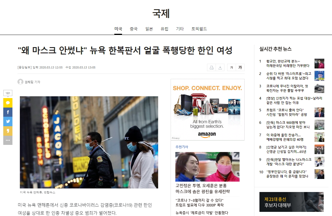 코로나 19로 인해 미국에 사는 아시안들에 대한 타인종의 혐오 범죄가 하나둘 모습을 드러내고 있습니다. 지난번 뉴욕에서는 한 한인 여성이 마스크를 쓰지 않았다는 이유로 타인종에게 폭행당하는 일도 있었죠. 그런데 이번에는 뉴욕 지하철에서 비슷한 인종 혐오 사건이 일어났습니다.