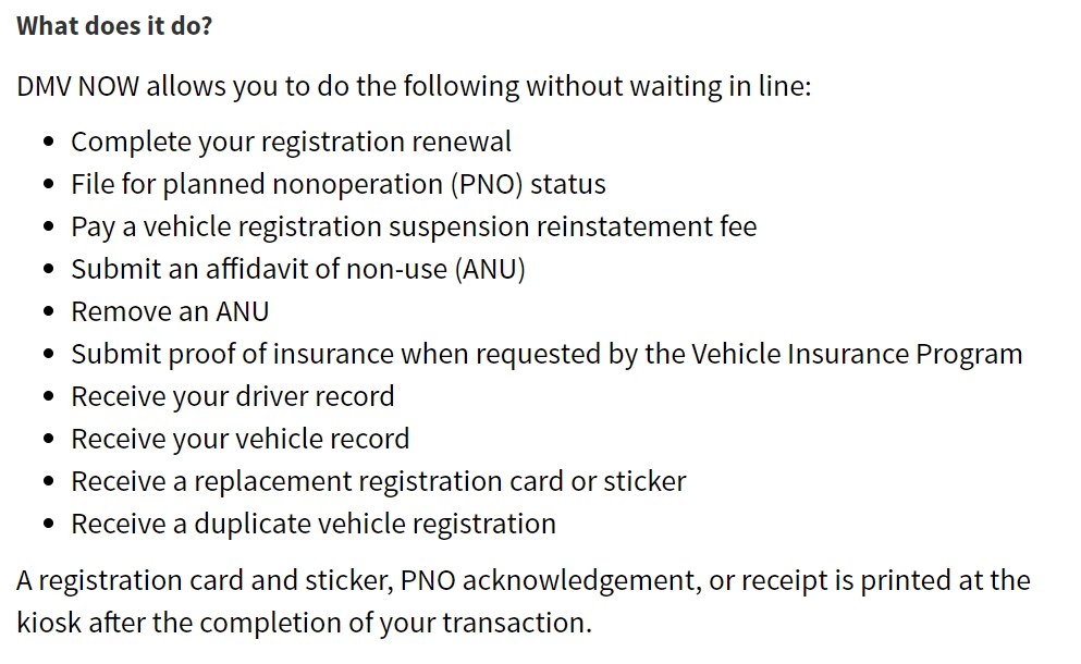 DMV NOW가 더 많은 기능을 가지고 있으면 좋겠지만 사실 이 기계를 통해 할 수 있는 일들은 한정적입니다. 차량 등록증 갱신이나 드라이브 레코드 확인, 보험 정보를 갱신하는 기능 정도를 만날 수 있습니다. 물론 해당 내용으로 골치를 앓는 분들에게는 이 마저도 정말 천국이겠네요. 코로나 19로 DMV가 닫는 동안 운전면허증 갱신은 다행스럽게도 3~5월 사이 만료자에 한해 운전기록상 이상이 없는 경우 60일 자동 연장을 해준다고 합니다. 자세한 내용은 DMV를 통해 확인하시면 좋겠네요.