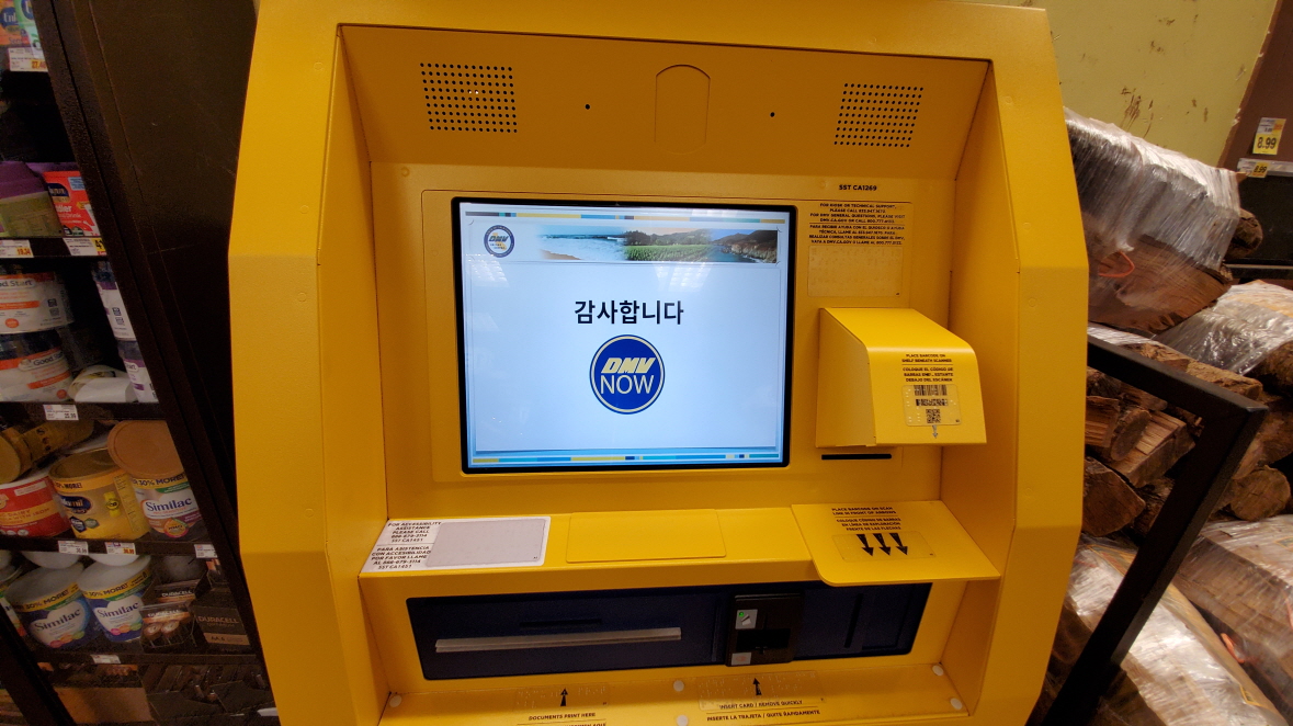 뭔가 방법이 없을까 고민하던 끝에 CA DMV NOW라는 키오스크 기계가 눈에 들어옵니다. 운전면허 갱신이 아닌 차량 등록 갱신은 저도 항상 DMV 건물 안에 자리한 키오스크를 통해 기다리지 않고 쉽고 편하게 끝냈습니다. 그런데 그 키오스크 기계가 DMV 건물이 아닌 일반 마켓, 상점 등 캘리포니아 내 상당한 곳에 자리해 있다는 것을 발견했습니다. 혹시나 하는 마음에 마스크와 장갑을 끼고 찾아간 마켓에서 DMV NOW 키오스크를 만날 수 있었죠.