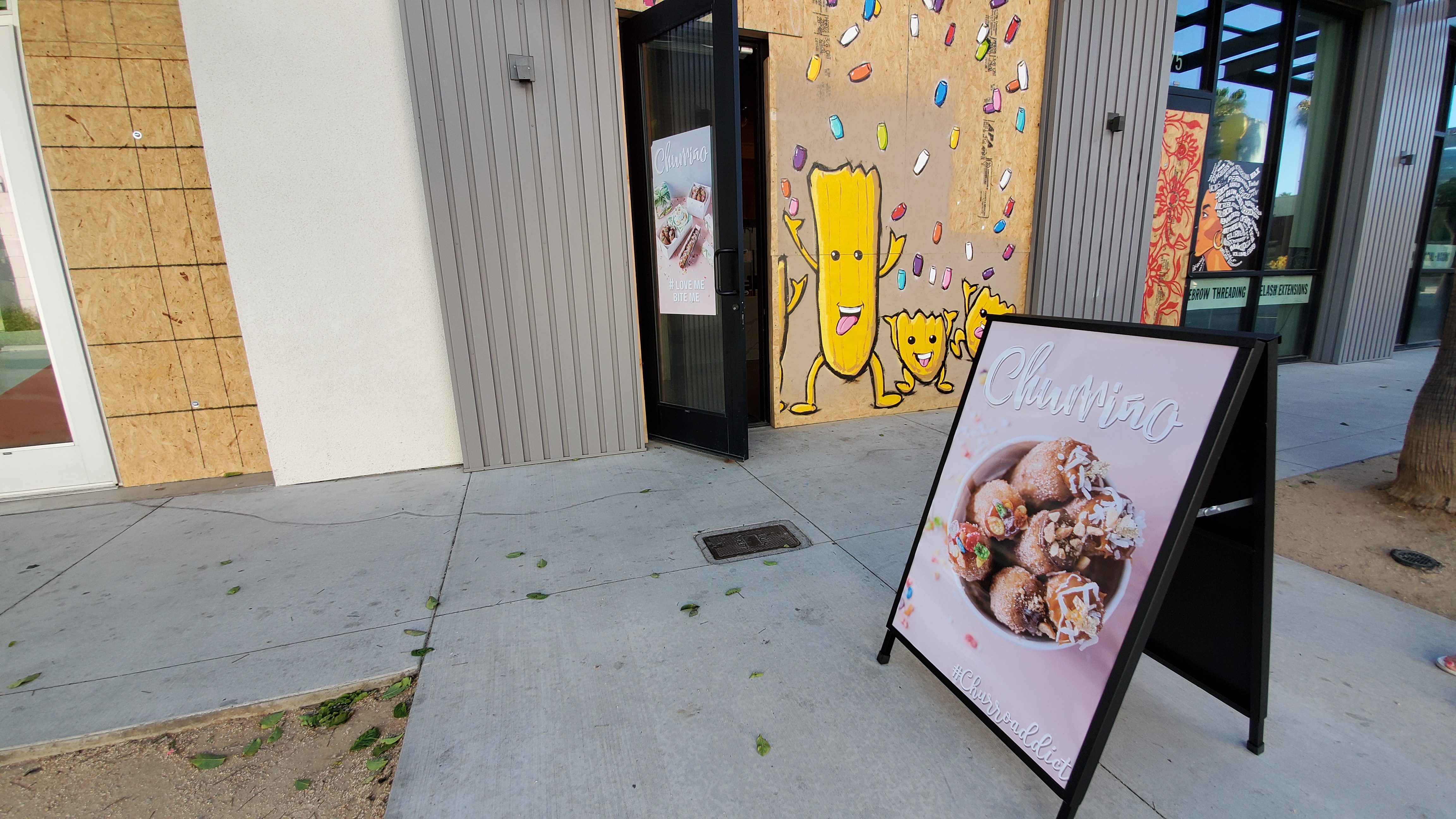 저는 그중에서 라틴 본토의 츄로맛을 즐길 수 있다는 츄리노(Churrino)라는 아주 재미있는 집을 찾아가 봅니다. 가게는 3가와 4가를 잇는 프로미나드 길 중간에 자리해 있습니다. 최근 롱비치 디운타운 일대 조지 플로이드와 관련된 시위 중 일부 약탈 등이 있었습니다. 그래서 제가 방문한 때는 대부분 가게가 입구와 유리에 나무 판자를 더해 가게를 보호하고 있네요. 그런데 롱비치가 워낙 예술적 감각인 도시인지라, 나무 판자마다 각자 가게의 개성을 살리는 그림을 그려 놓았습니다. 저 역시 작은 츄리노 간판보다 나무 판자에 그려진 노란 츄로들을 보고 가게를 찾았습니다.