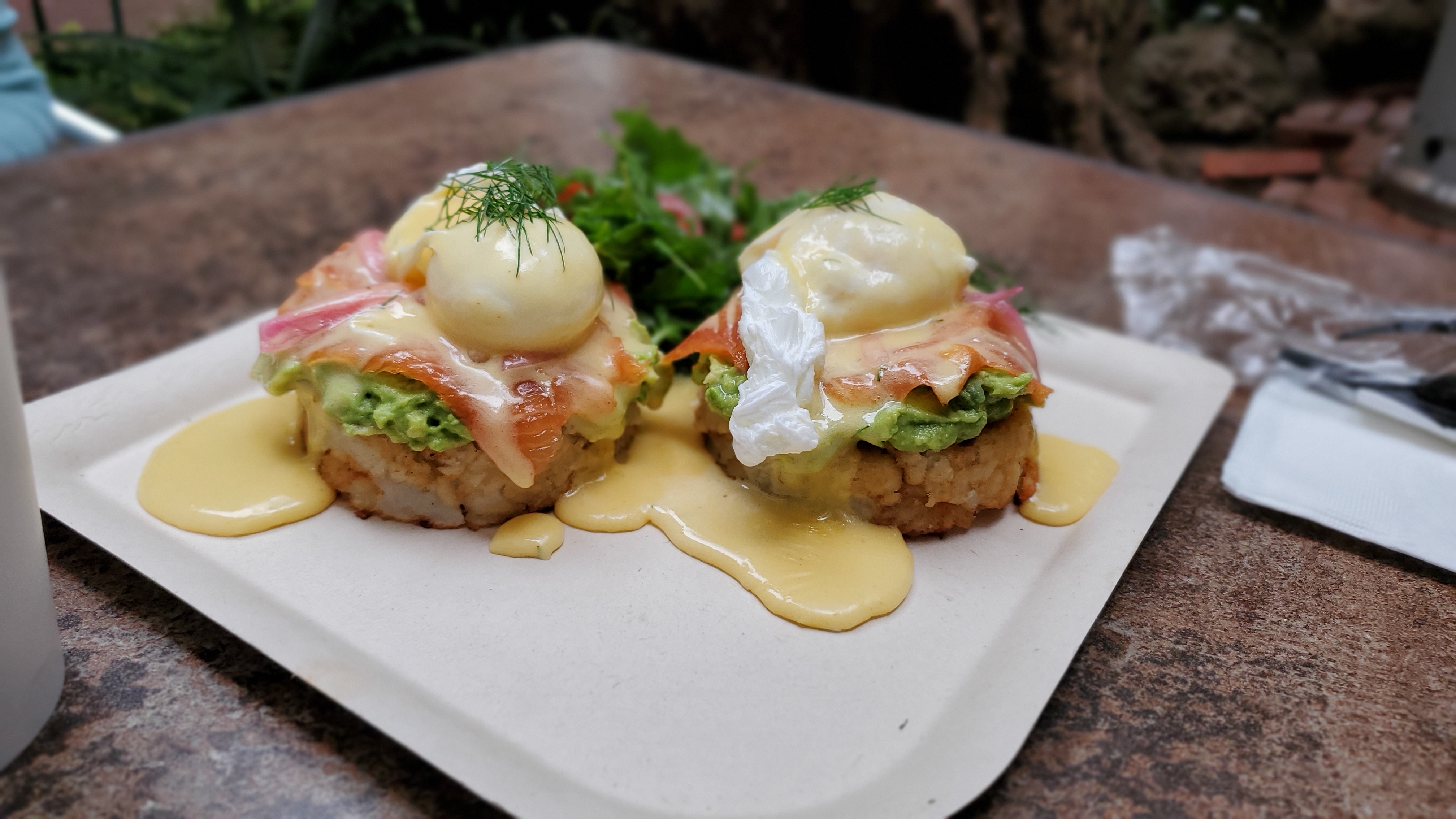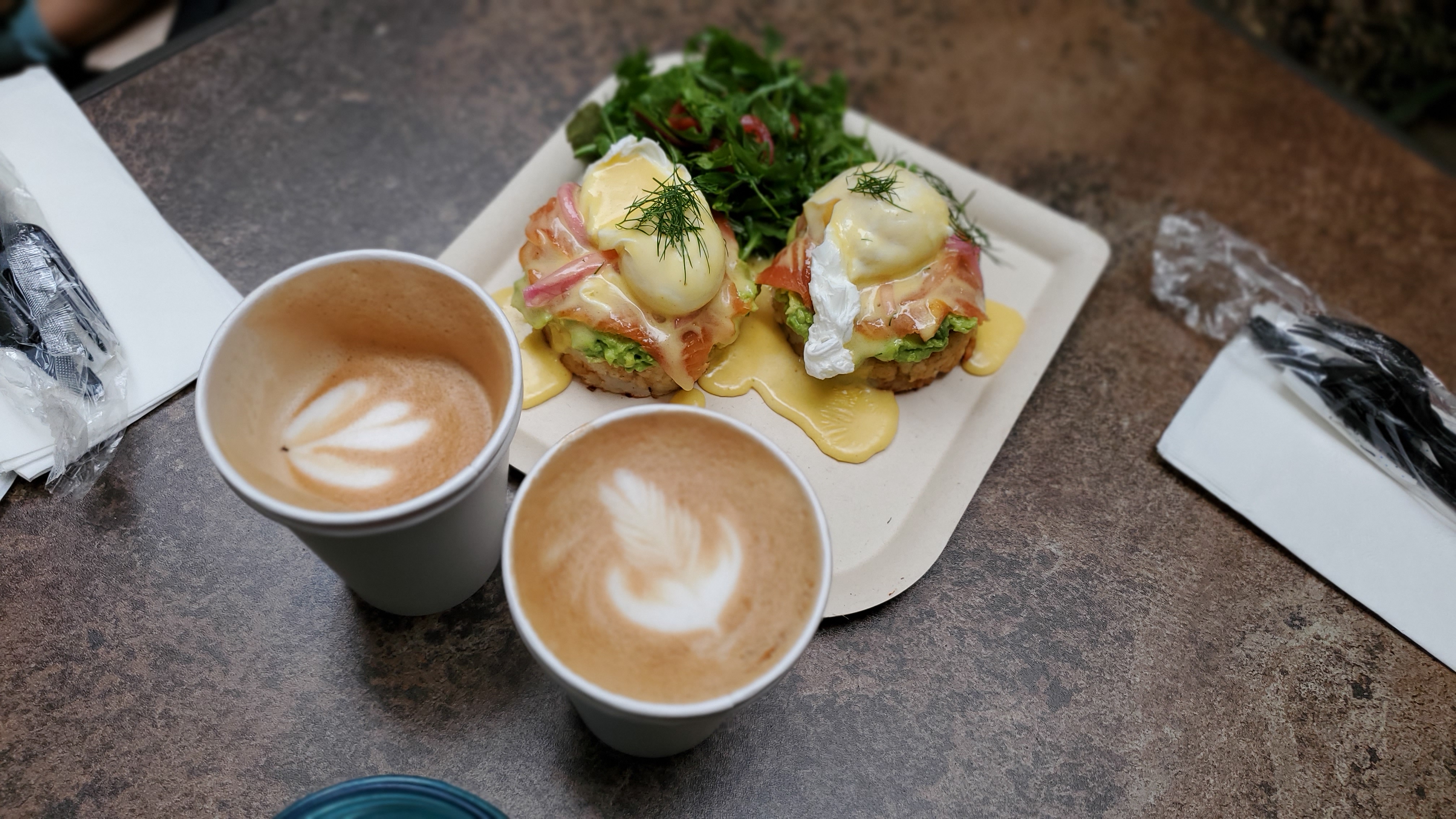 저는 이른 아침인지라 카페 라테와 에그 베네딕트를 시켜봅니다. 수란이 생명인데 생각보다 탄력이 좋고 계란 맛이 너무 좋네요. 여기에 해쉬브라운을 비롯해 치즈, 다양한 야채가 정말 입맛을 돋우네요. 여기에 라테는 거품 맛이 텁텁하지 않고 끝이 부드러워 좋은 품질의 우유를 쓴 것으로 생각되네요. 무엇보다 야외 테이블 느낌이 너무 좋습니다. 바닷가에서 시원한 바람이 가게 안쪽까지 불어오네요.