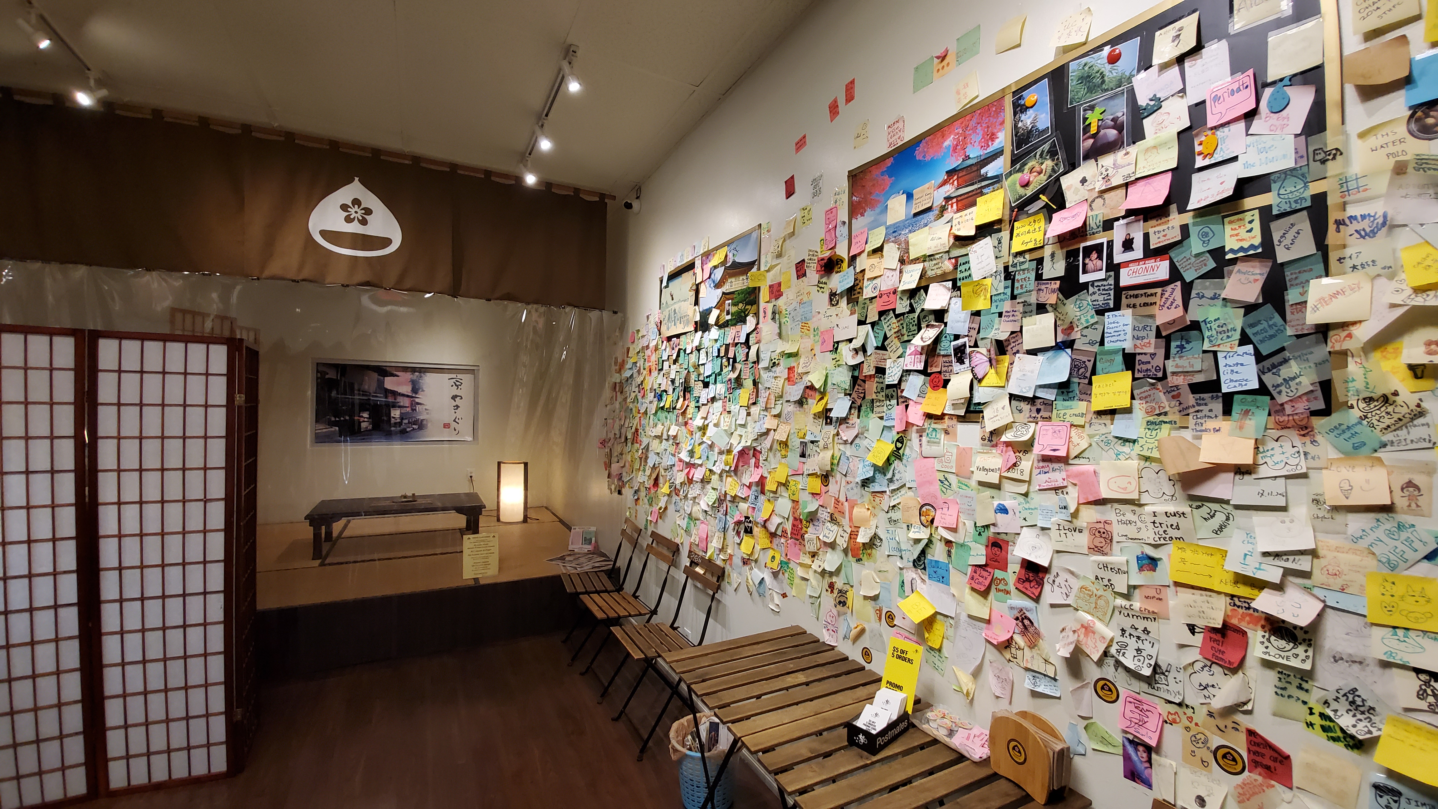그런데 좀처럼 일본이 아니고서는 구하기 힘든 히사야 교토 군밤이 토렌스에 있다는 것은 어쩌면 정말 반가운 일이 아닐지 모릅니다. 가게 입구는 군밤집이라고는 잘 알아채기 힘들 정도로 일반 카페와 비슷한 느낌입니다. 안으로 들어가면 오른쪽 벽에 엄청나게 많은 포스트잇 글씨가 눈길을 끕니다. 저마다 사연도 많고 사진을 붙여 놓은 사람도 있네요. 그만큼 이 가게가 일본인들에게는 참 정겨운 간식을 파는 그런 곳이 아닐까 합니다.