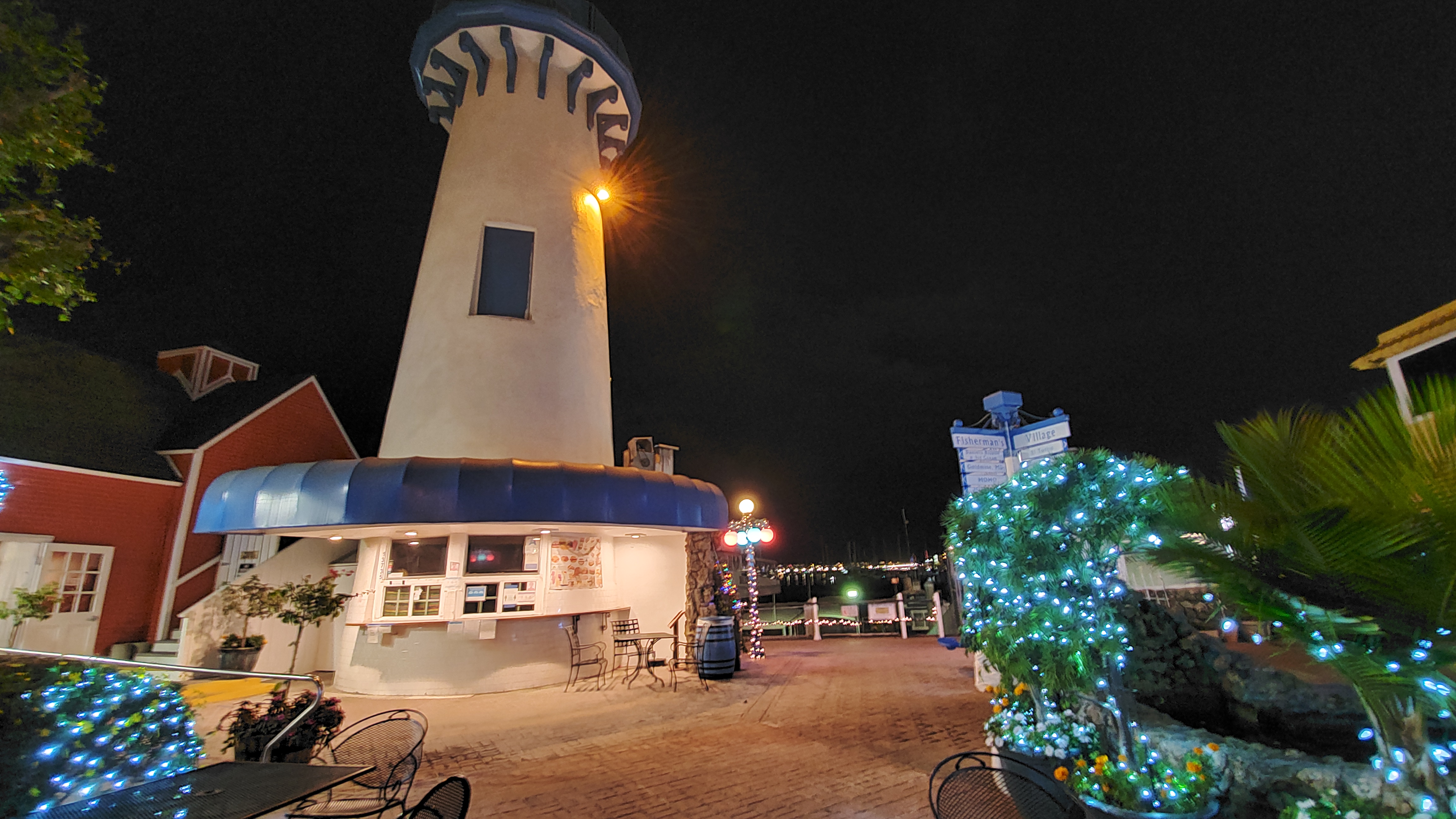 빌리지 가운데는 큰 등대가 있고 그 주변으로 예쁜 연말 조명 장식을 두른 가게들이 있네요. 여기에는 아메리칸, 멕시칸, 이탈리안 식당이 있고 바를 포함해 크고 작은 가게들이 있습니다. 그런데 코로나 19 때문이겠죠. 정말 황량해도 너무 황량하네요.
