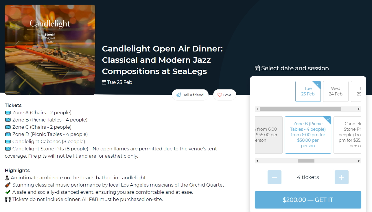 캔들라이트 이벤트는 오는 2월 23일을 시작으로 같은 자리에서 4월까지 진행될 예정입니다. 그저 그런 야외 식사가 아닌 멋진 음악과 분위기가 있는 로맨틱한 야외 식사를 꿈꾸신다면, 캔들라이트 OC로 꼭 한번 들려보세요. 티켓은 피버(FEVER)를 통해 온라인 구매할 수 있습니다.