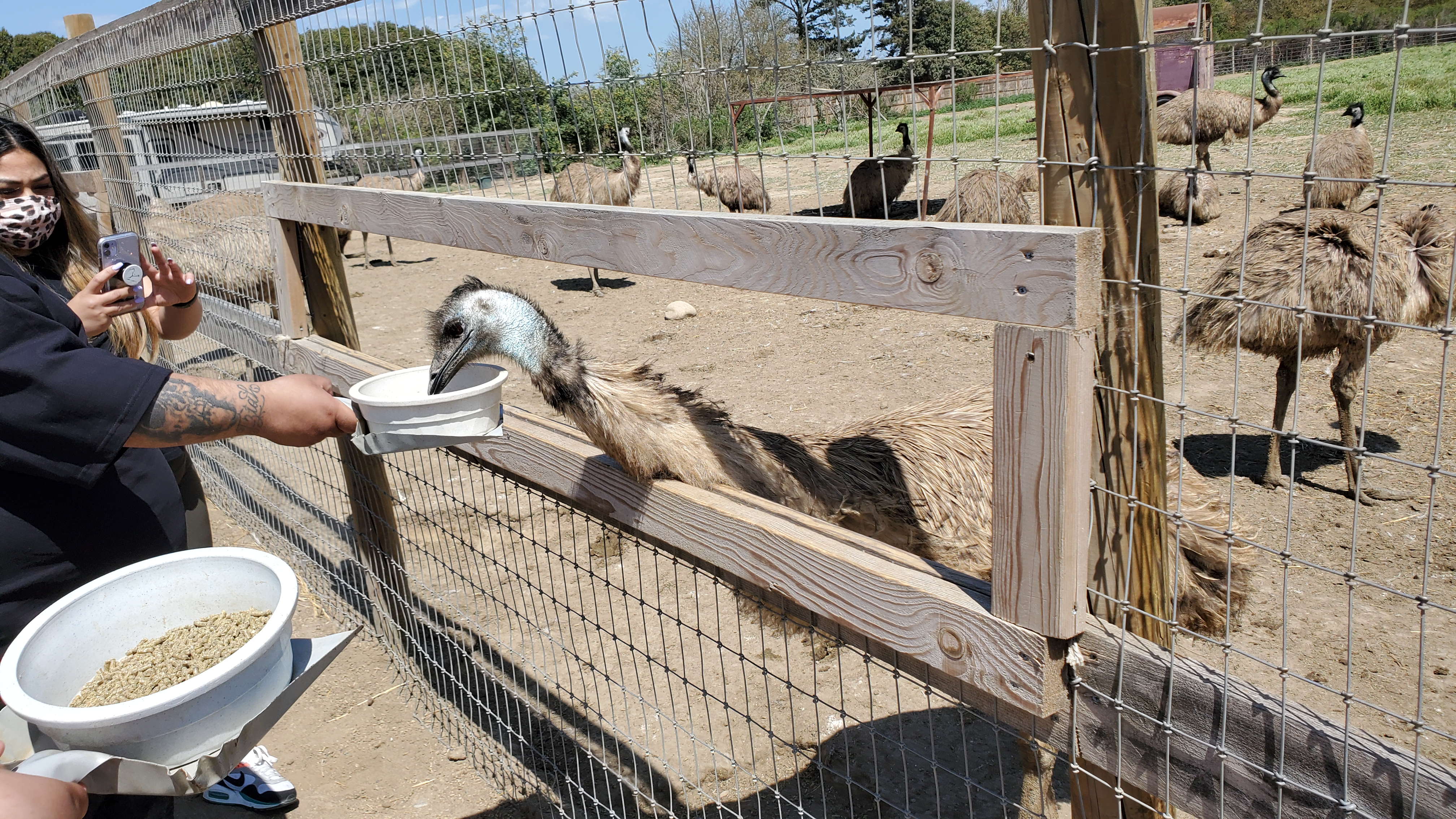 세션별 울타리가 쳐 있는 곳으로 가까이 가면, 타조에게 밥을 줄 수 있는 공간이 있습니다. 여기에 밥통을 대고 있으면 어디선가 타조가 달려와서 먹기 시작합니다. 그런데 새처럼 뭐 우아하게 먹을까 싶었는데, 밥을 향한 공격 속도가 만만치 않네요. 엄청 빠른 속도로 와서 먹기 때문에 혹시라도 아이들에게 밥을 주려 할 때는 조금 조심하시는 것도 좋습니다.