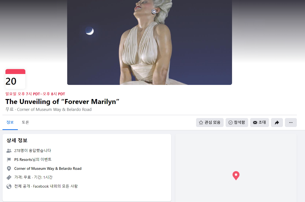 팜스프링스에 세워지는 포에버 마릴린은 6월 20일 오후 7시 팜스프링스 뮤지엄 인근에서 제막식이 있을 예정이라도 하네요. 행사는 약 1시간 정도 진행될 것으로 보이며 관람은 무료라고 합니다. 팜스프링스로 돌아온 그녀를 보고 싶다면, 6월 20일 일요일에 팜스프링스에 한번 들려보세요.