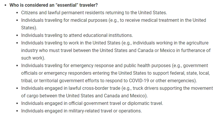 이게 좀 근데 애매하긴 한데요. 일단 주 멕시코 미국 대사관에서 미국으로 들어갈 때 제한되는 '비필수 이동'에 대한 것을 관광, 레크리에이션, 도박, 미국 문화 행사 첨석과 같은 관광 목적 개인으로 규정합니다. 반면 '필수 이동'은 시민권자와 영주권자, 의료 목적으로 여행하는 개인, 교육 기관에 다니기 위해 여행하는 경우, 출장 목적, 국경을 넘나드는 합법적 거래 종사하는 개인(트럭 운전자 등), 군사 관련 작전에 종사하는 개인 등으로 규정합니다. 이 경우는 다시 미국에 올 수 있다는 것이죠. 교통수단에 관해서도 이 조치는 항공 등에는 적용되지 않지만, 육로나 여객선 여행 등에는 적용된다고 합니다.