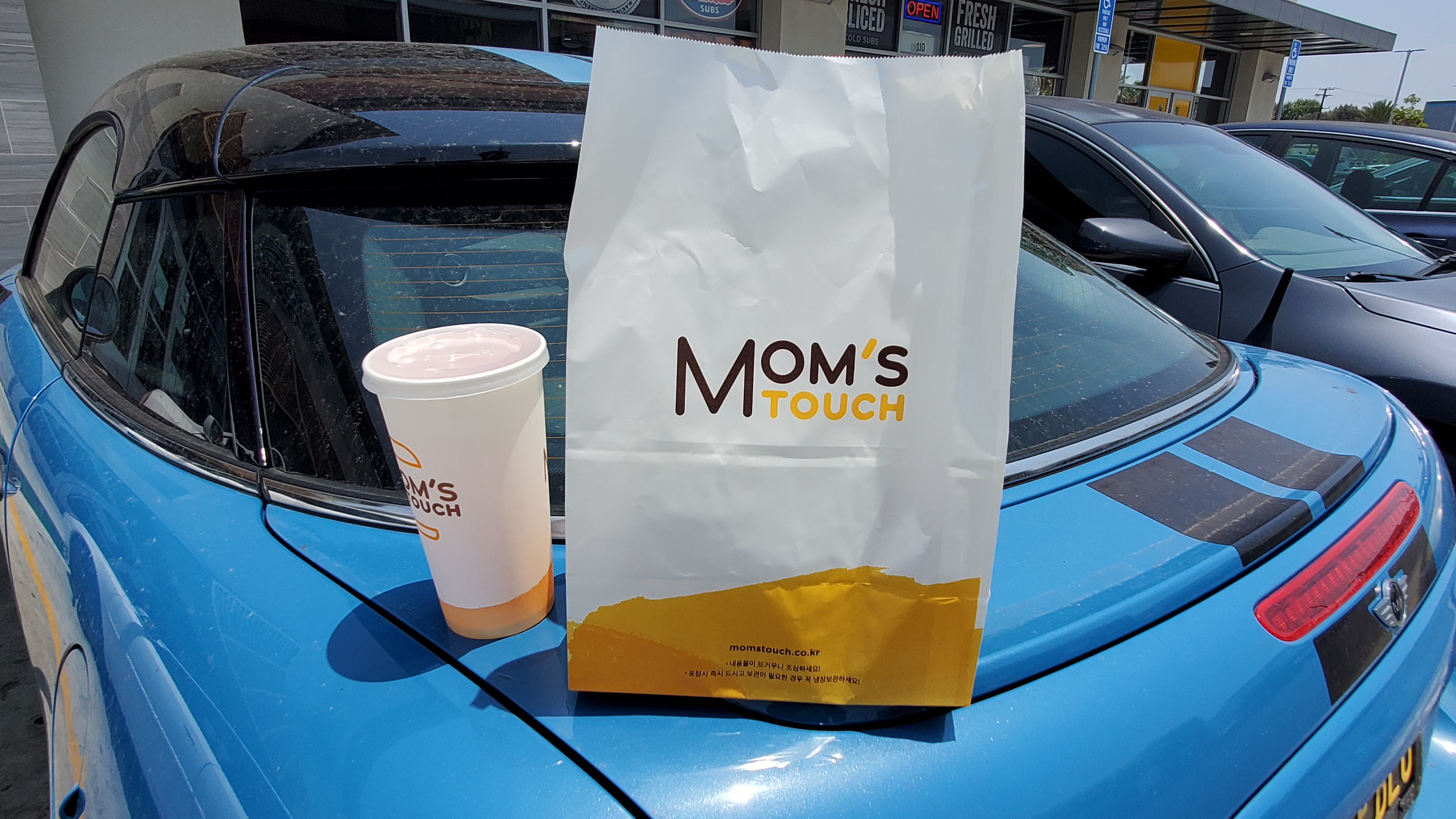 여하튼 다시 캘리포니아에 문을 연 맘스터치는 이전 콩코드점에 사용한 것과는 다른 로고와 브랜드 컬러를 사용합니다. 다시 문을 연 맘스터치의 1호점은 가디나 플라자입니다. 그리고 곧 롱비치와 시티 오브 인더스트리 점에도 문을 연다고 하네요. 위치 등을 살펴보면 새롭게 문을 여는 맘스터치는 주류 입맛을 본격적으로 공략하겠다는 모습이 엿보입니다. 하지만 그럴 거면 봉투부터 좀 바꿔야 하지 않을까요? 봉투 아래에 한글과 한국 웹사이트 주소가 그냥 찍혀있는 걸 보니 조금 준비가 덜 됐나라는 느낌도 듭니다.