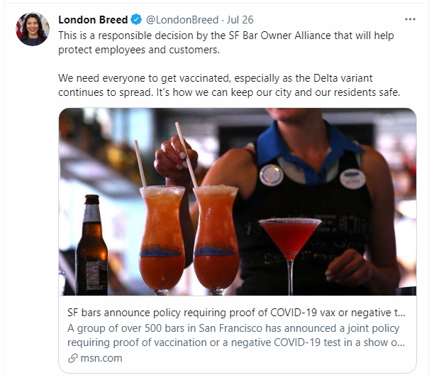 샌프란시스코 주점 협회. 인도어 원할 경우 백신 접종증 요구하기로