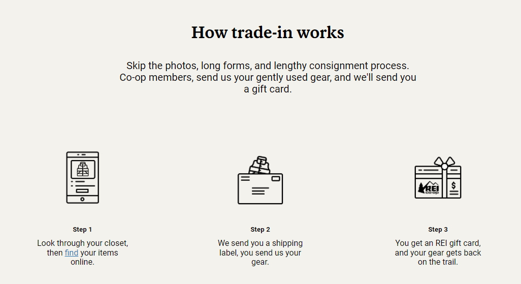 일단 멤버가 되면 REI 트레이드 인 사이트에 들어갑니다. 이곳에서 먼저 자기가 팔 물건을 'FIND YOUR ITEM'을 눌러서 매칭을 시켜봅니다. 만약 내가 파는 물건이 REI 트레이드 인 조건에 맞는 제품이면 예상 교환 가격이 나옵니다. 이 가격은 실제 진행됐을 때 다소 높거나 낮아질 수 있다고 하네요. 예상 트레이드 인 가격을 확인하고 REI에 요청하면 쉽핑 라벨을 REI가 보내주고, 이것을 붙여 REI로 교환 물품을 보내면 됩니다. 그럼 REI에서 해당 트레이드 인 밸류가 담긴 기프트 카드를 준다네요.