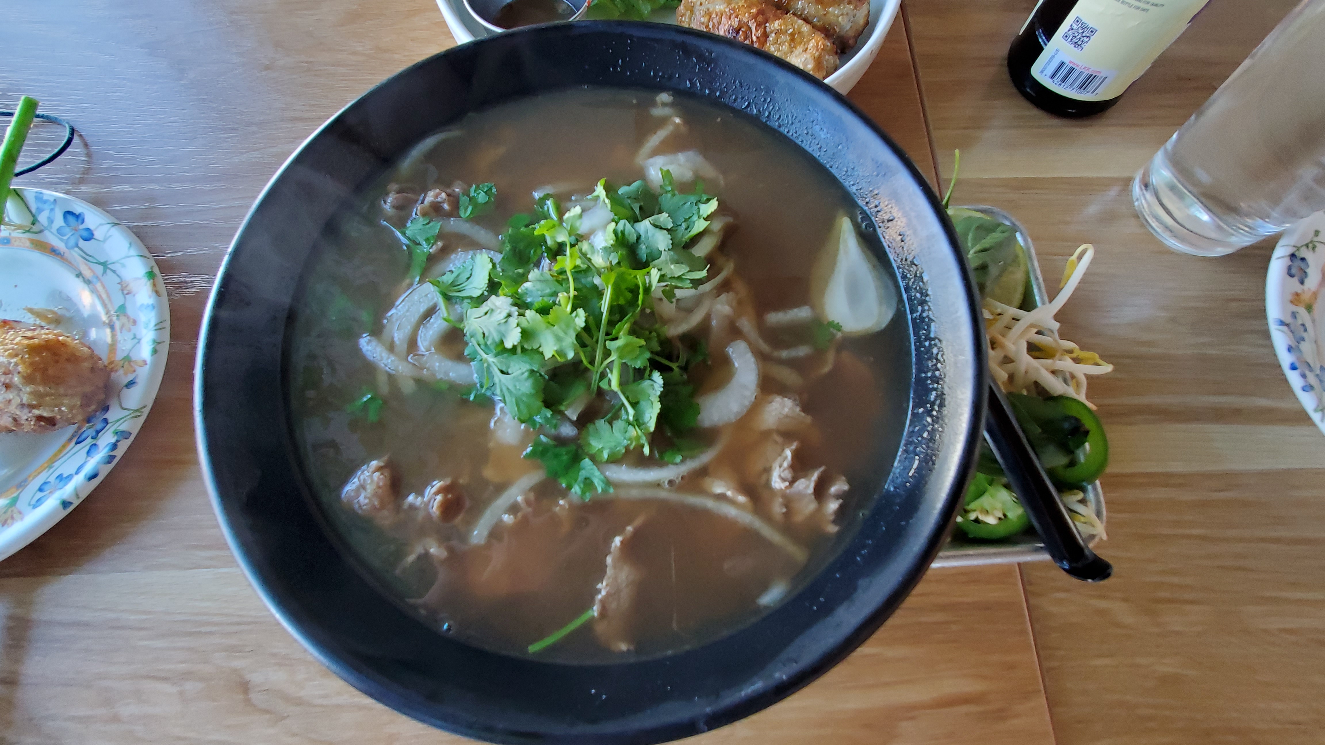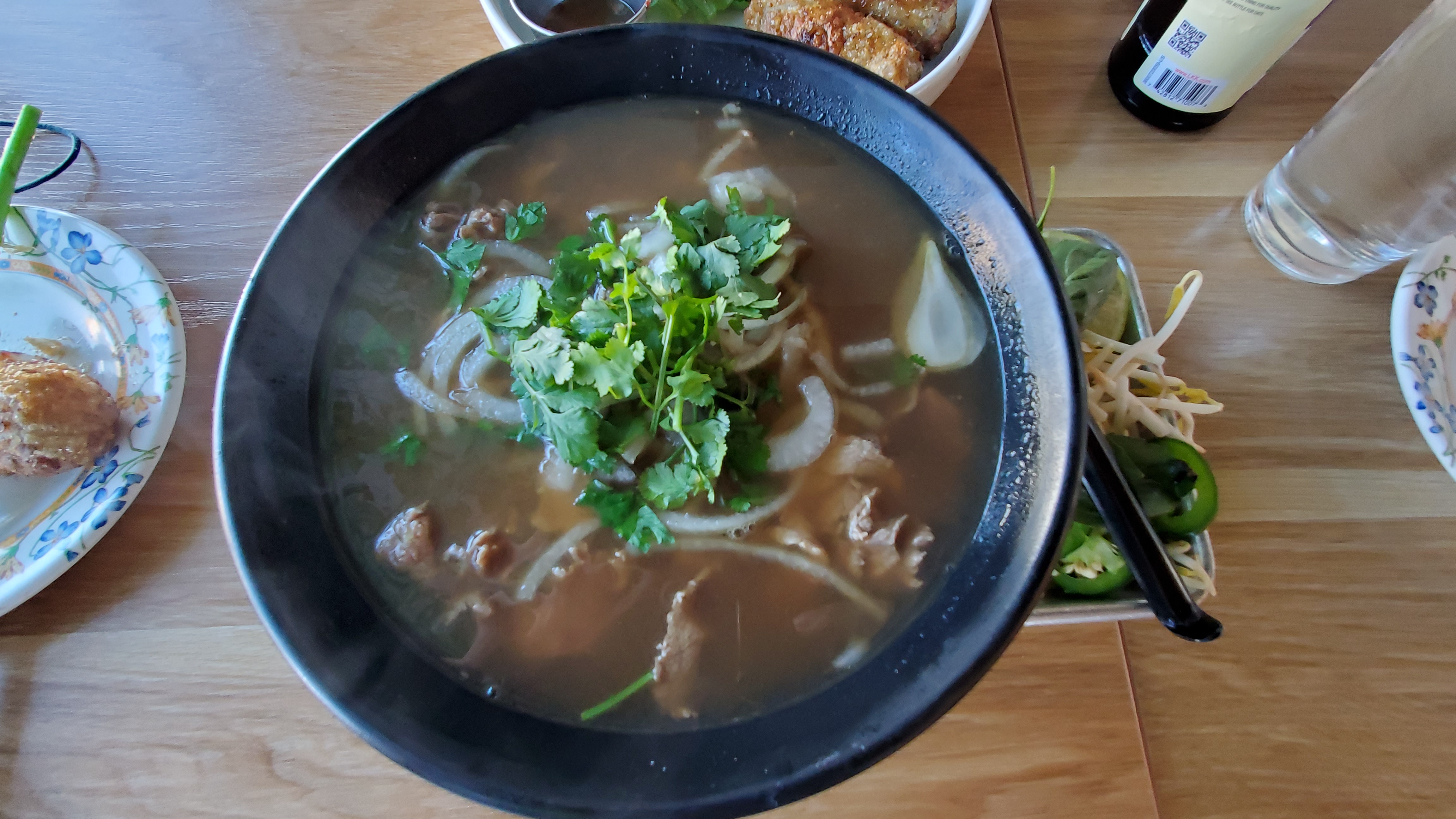 쌀국수 역시 담긴 그릇과 주변 플레이팅이 좋네요. 모던하게 다가옵니다. 아무것도 안 섞은 상태로 일단 국물부터 맛을 봅니다. 개운하고 시원한 느낌. 첫 맛은 좋지만 이내 텁텁하게 느껴지는 다른 베트남 쌀국수와는 확연히 다른 느낌입니다. 국수는 그렇게 특이하지는 않고 일반적입니다. 고기 손질도 무난한 편이고요. 무엇보다 국물이 진짜 시원하다 보니 한 그릇 뚝딱 비우게 되네요.