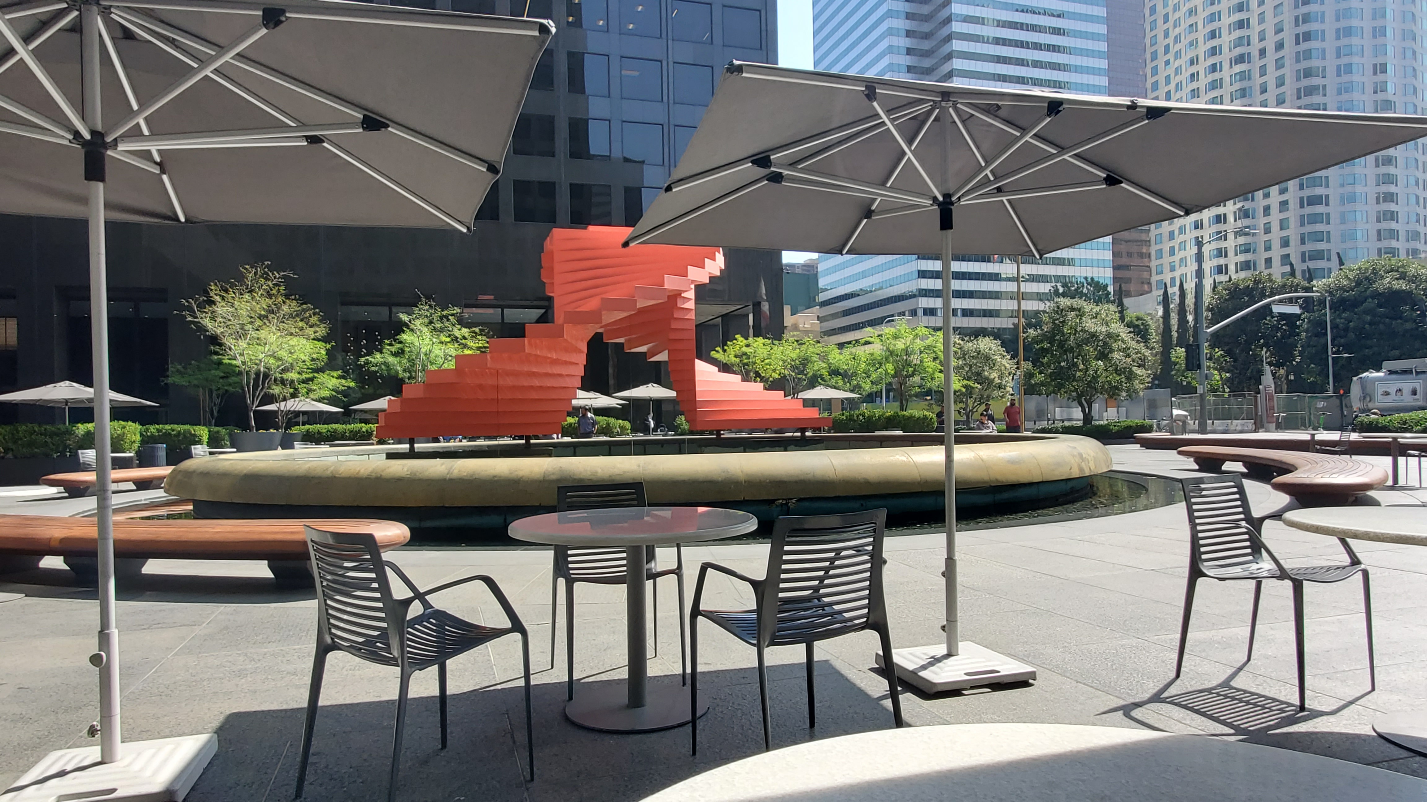 다운타운 LA 웨스트 5번가와 6가 스트리트, 플라워 스트리트가 지나는 길 선상에 작은 카페가 하나 있습니다. 유명한 겐슬러 건축 회사 뒤편, 시티 내셔널 플라자 앞마당에 자리한 이 카페는 이름도 참 쉽습니다. NICE 커피라는 이 팝업 카페는 바쁜 다운타운 LA 가운에 숨을 좀 쉴 수 있는 휴식처로 그만입니다.