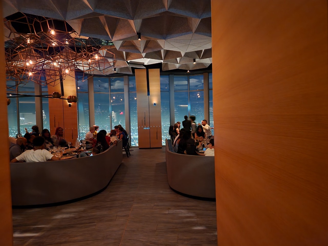 71층에 도착하면 바로 앞에 식당 프런트 데스크가 있고, 예악자 확인 후 자리로 안내합니다. 식당은 바와 그룹 테이블 그리고 창가쪽 테이블과 바로 구성되어 있습니다. 여름 시즌에는 적어도 오후 7시 30분 이후에 자리를 잡아야 멋진 야경을 볼 수 있습니다. 저는 로스앤젤레스 벙커힐과 아트 디스트릭, 멀리 다저스 구장이 보이는 자리로 안내를 받았습니다.