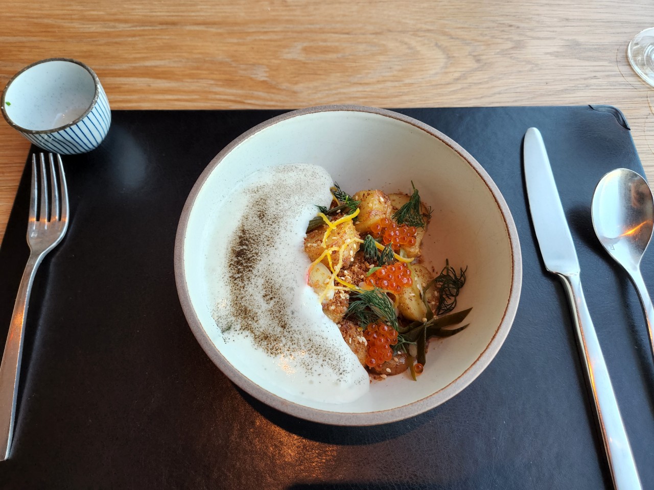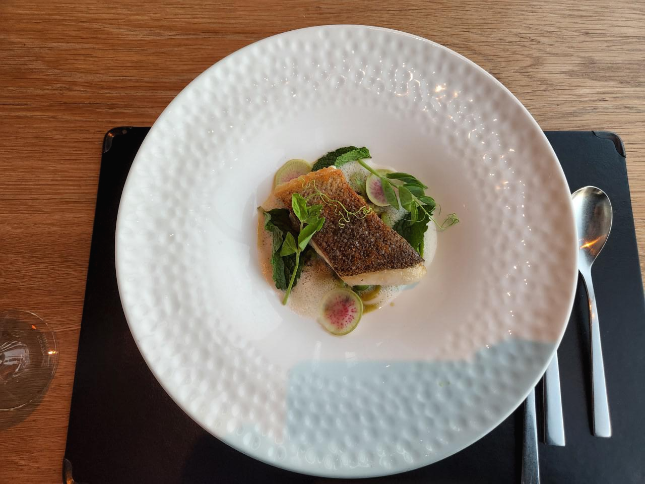 자리를 잡으면 식전 음료가 제공되구요, 코스 세 가지를 골라서 알려주면 주문이 끝납니다. 창가 쪽 자리는 격벽이 설치되어 있어서 최대한 프라이버시가 보장되어 있어 좋았고요, 사람이 많을 때 방문했는데 벽 쪽 자리에 앉는다면 조금 아쉬울 것 같기도 합니다.