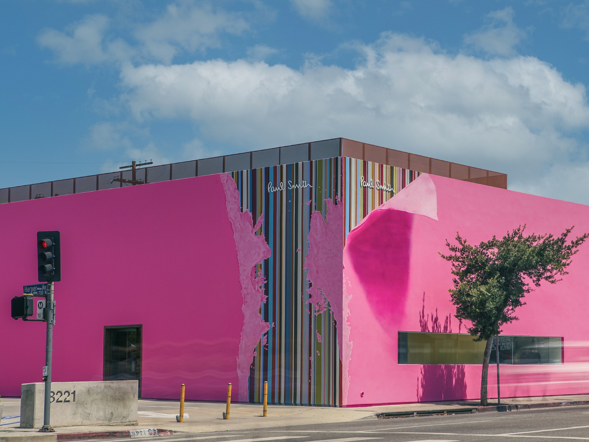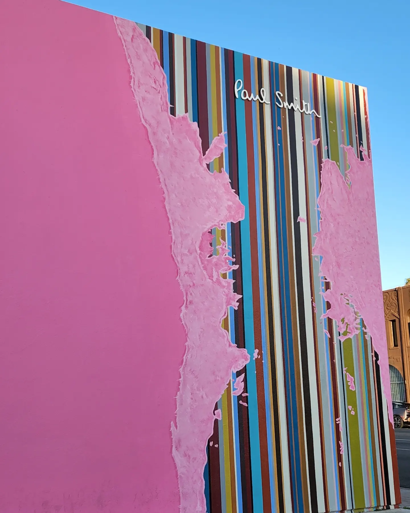 멜로즈 길 방향 건물 모서리 일부가 핑크를 벗고 폴스미스의 시그니처인 스트라이프가 보이도록 칠해졌습니다. 이는 폴스미스 22SS 시즌 캠페인에 따른 것으로 실제 건물 벽 일부가 벗겨지고 그 안에 줄무늬가 보이는 것 같은 느낌을 줍니다. 각 스트라이프는 라인을 일직선을 정확하게 유지하기 위해 세 명의 화가가 참가했다고 하며, 22피트 높이에 40가지 색상이 포함되었다고 하네요.