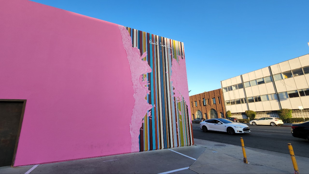 LA 멜로즈 패션 거리를 대표하는 아이코닉 폴스미스 핑크 월이 새롭게 단장했다는 소식입니다. 이곳은 풍선껌 핑크색으로 꾸며진 폴스미스 매장인데요, 워낙 벽이 예뻐서 인스타그램을 찍는 이들의 배경으로 선호하는 장소입니다. 일반적으로 모든 벽이 다 핑크였는데, 이번에 새롭게 단장하면서 외벽 일부가 바뀌었습니다.