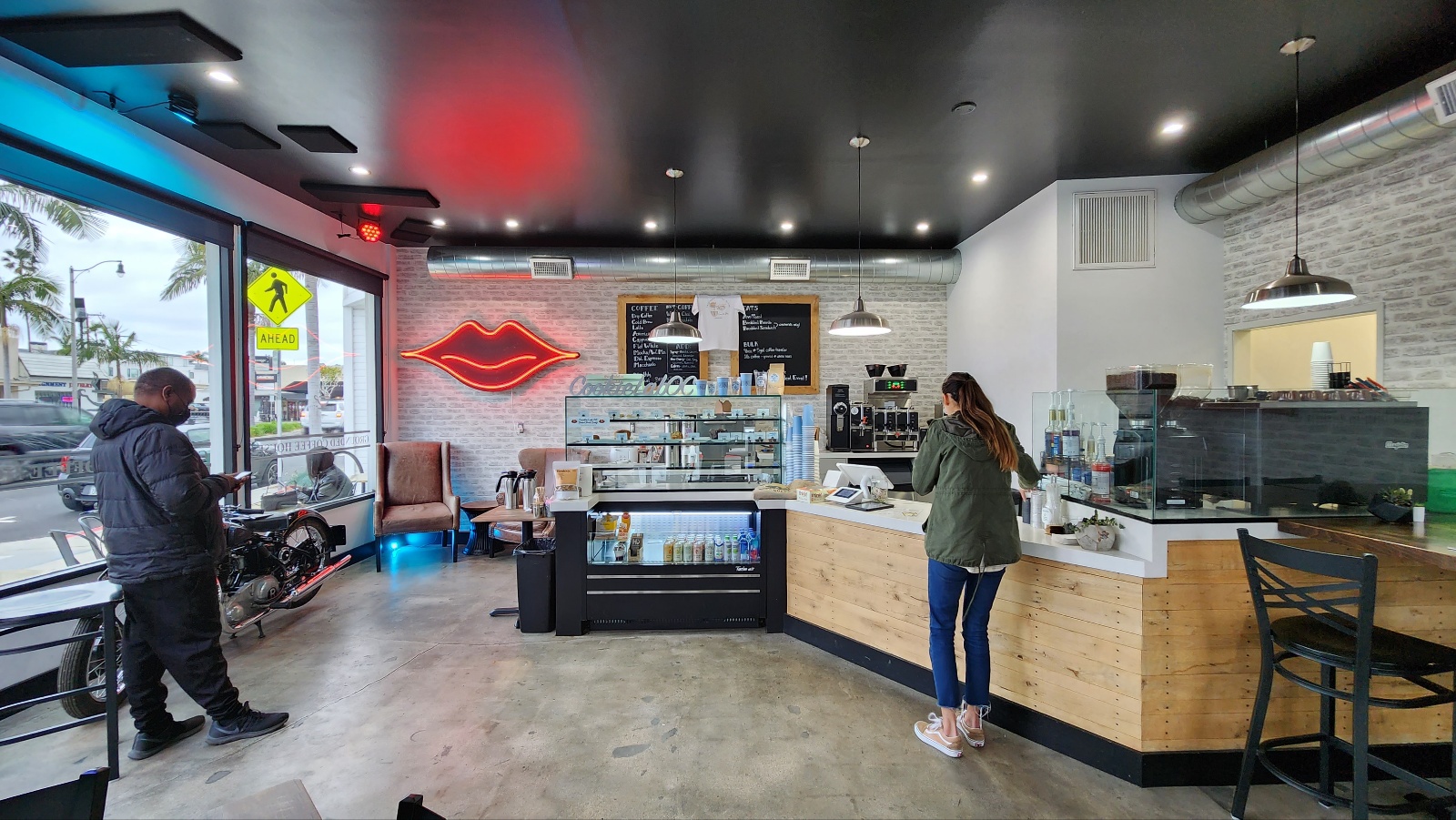 가게에는 다양한 메뉴가 있는데, 개인적으로는 라벤더 라떼를 권합니다. 사실 사진에서는 상당히 예뻤는데, 이날 바리스타는 잘 만들어주질 못했지만. 맛은 그런대로 마실만했습니다. 날씨가 좋은 날에 오시면 야외 테이블에서 PCH를 달리는 멋진 차들을 구경하며 따뜻한 햇살을 즐길 수 있고요, 카페 안에도 예쁜 입술 모양 네온 장식 아래 앉아 멋진 사진을 찍을 수도 있습니다. PCH를 따라 뉴포트 비치에서 라구나 비치로 혹은 그 반대로 달리고 계신다면, 꼭 이 카페에 들러 맛있는 라테와 쿠키를 만나보세요.