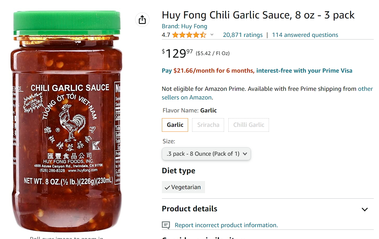 스리라차 소스 공급 부족이 암시장을 들끓게 하고 있습니다. 이 매운 소스의 인기는 현재 미국 이베이와 같은 인터넷 상거래 사이트에서 70달러까지 높은 가격에 팔리고 있으며, 아마존에서는 129달러 소스도 등장했습니다. 스리라차 소스를 만드는 Huy Fong Foods가 만드는 스리라차 소스는 현재 원자재 부족 어려움을 겪는 것으로 알려졌습니다. 회사는 지난가을 시즌 일부 생산이 재개됐지만 여전히 제한된 공급을 진행하고 있습니다. 사측은 정확히 언제 공급이 늘어날 것인지에 대한 추정치를 말할 수 없다는 입장이라고 하네요.