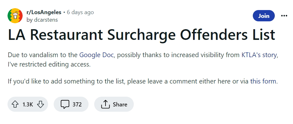 미국 소셜 커뮤니티 사이트 레딧에서는 최근 LA 지역 식당을 대상으로 추구 수수료를 부당으로 받고 있는 식당을 목록을 만들어 회원들과 공유하고 있습니다. 이미 100여 곳이 넘는 식당이 부당한 추가 수수료를 부과하는 식당에 이름을 올렸습니다.