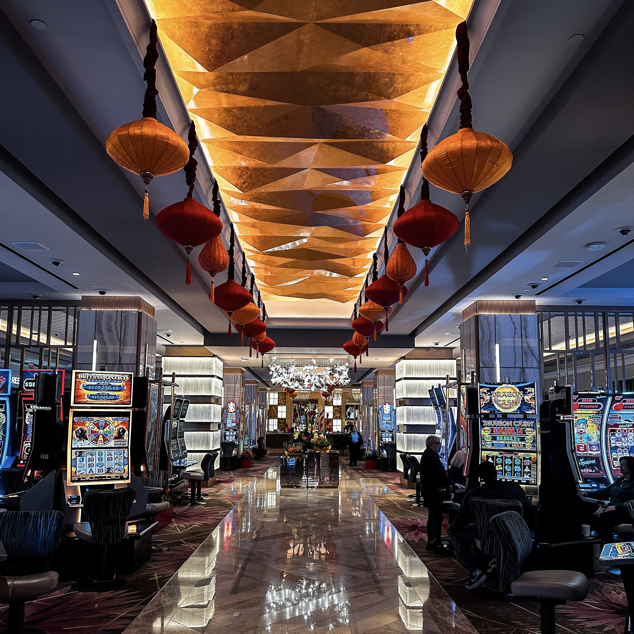 야마바에서는 2월 25일까지 방문자를 위해 리조트 곳곳에 용 장식을 설치합니다. 화려한 로비를 지나 카지노로 이동하는 중간 통로에 용 모형이 자리했고, 주차장에서 카지노로 이어지는 통로에는 1층으로 이어지는 계단을 덮는 듯한 큰 용 장식을 만날 수 있습니다. 특히 2월 10~11일, 매일 오후 6시 30, 7시 30, 8시 30분에는 전통 사자, 용 춤 공연이 펼쳐진다고 하니 꼭 챙겨보세요.